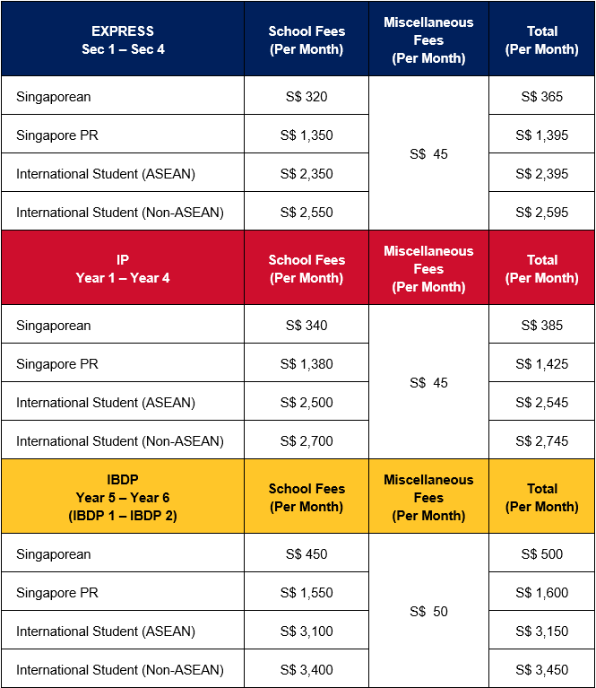 School fees with effect from 1 January 2026 are tabulated below. Admission to our school is merit-based and no Singaporean admitted to ACS (Independent) will be turned away because he / she cannot afford school fees. Singapore citizens may seek information on the various financial assistance programmes from our Deputy Principal, Mr Patrick Soo (patrick@acsindep.edu.sg).