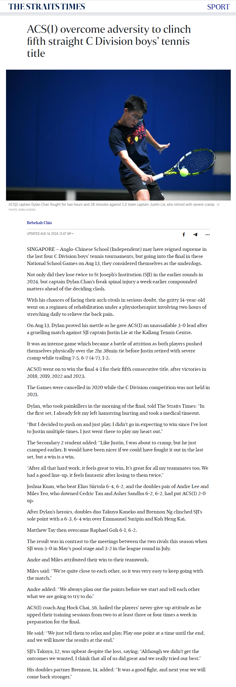 ACS(I) overcome adversity to clinch fifth straight C Division boys’ tennis title