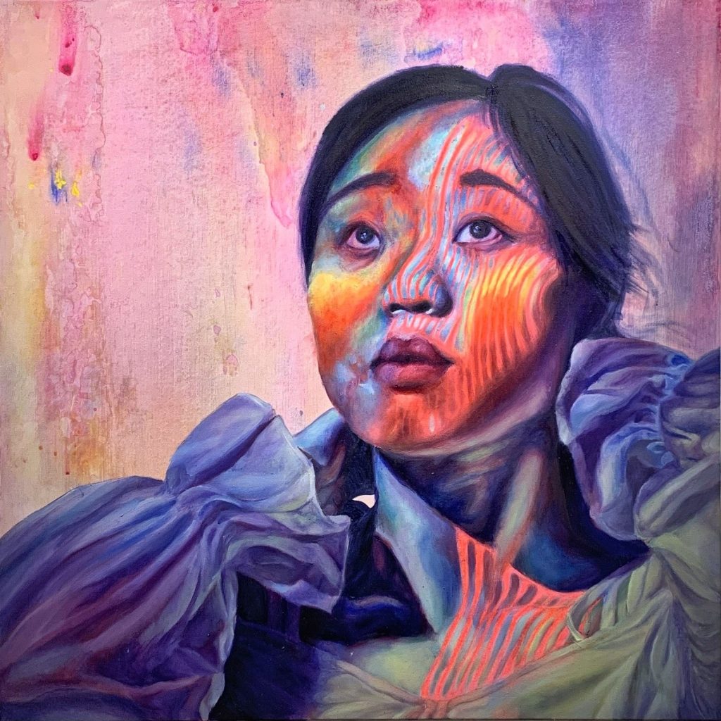 This piece aims to juxtapose the restrictiveness of dwelling and overthinking, with the liberation from seeking contentment in detaching from the past. This dichotomy is shown via the symbol of the blanket. In the painting, the folds tightly winding the body appear complex, but become simple when outstretched by a person’s decision to hold it at a distance. This idea of healthy detachment is contrasted by the depiction of spiraling within complexity in Incomprehensible Synthesis.