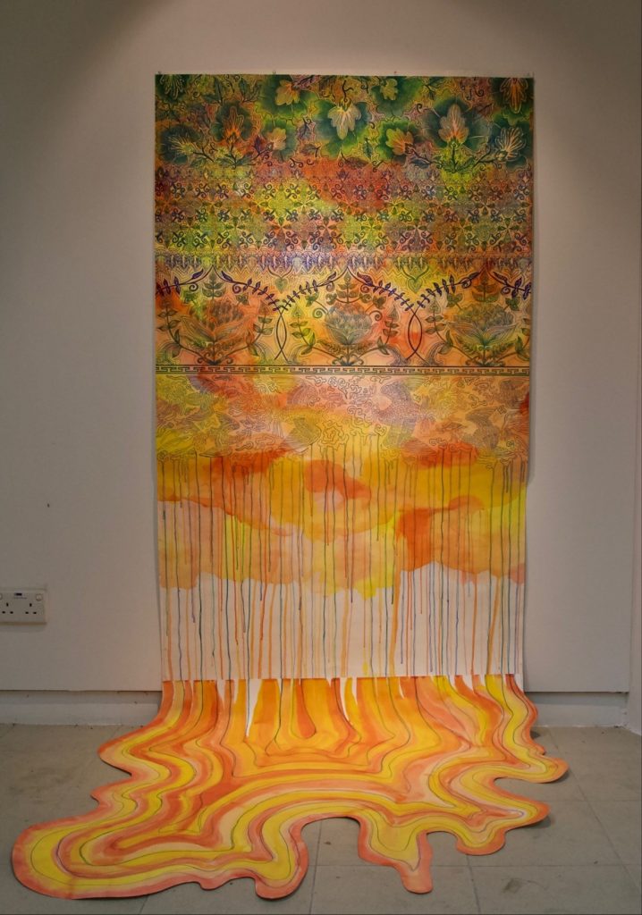 This piece depicts the underlying issue in my series – the rapid erosion of Asian cultures as a consequence of globalisation, a byproduct of westernisation. Replicating patterns found in the intricate embroideries on a myriad of traditional Asian costumes (Peranakan, Thai, Indian, Korean), I gradually used lighter toned markers and simpler details as I moved down the paper. This contributed to the “melting” of the patterns and pool of paper on the ground, mirroring the dilution of Asian cultures.